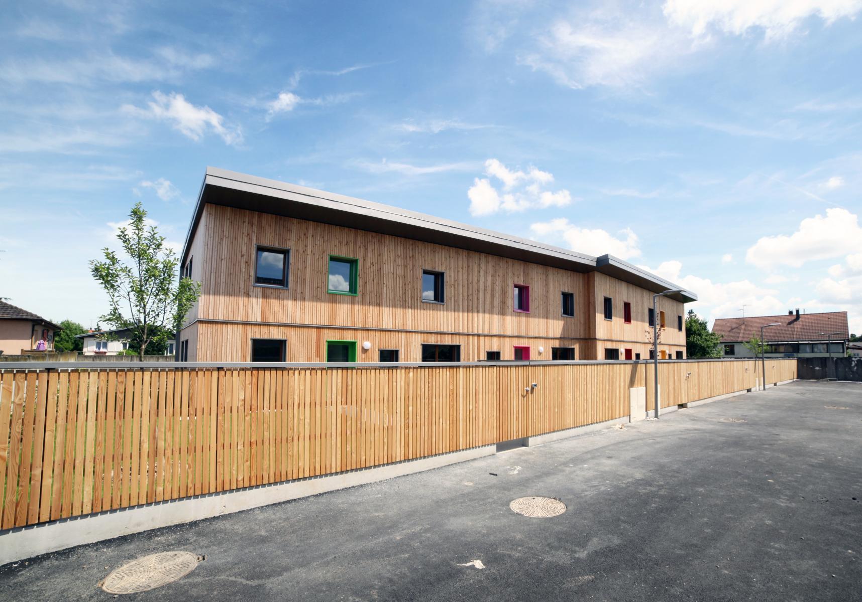 Approche environnementale : Le projet propose un bâtiment compact pour optimiser l'emprise au sol et les surfaces déperditives. La façade sud est largement vitrée et permet d'obtenir un bon ensoleillement. En hiver, les logements profitent d'apports solaires passifs importants et en été, le débord de toiture ainsi que les ébrasements profonds permettent d'éviter toutes surchauffes liées à l'ensoleillement direct. La façade nord est plus fermée. Le bâtiment est réalisé en ossature bois. Des murs séparatifs en béton apparent sont mis en place pour assurer l'isolation acoustique entre logements et pour apporter l'inertie nécessaire à ce type de construction. Le bois est largement présent. Ce matériau chaleureux, aux qualités naturelles indéniables, marque l'identité du projet qui s'engage vers une diminution de la production de CO2 pour limiter son impact sur le changement climatique.